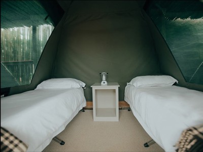 De sterke canvastenten zijn bijzonder eenvoudig en snel op te zetten. In het midden van de tent kan je rechtop staan, en ze zijn tweepersoons. Je slaapt op prima matrasjes (zie voorbeelden in de foto's hiernaast).
