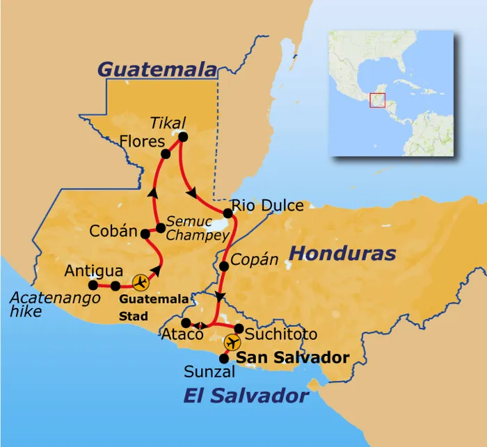 Tijdens deze rondreis door Guatemala, Honduras en El Salvador ontdek je een ongerept en avontuurlijk deel van Midden-Amerika. We trekken de jungle in om de eeuwenoude Maya-stad Tikal te verkennen en maken hikes door nationale parken. In Guatemala wagen we ons aan de uitdagende en epische Acatenango Hike, waar je oog in oog kunt komen te staan met de uitbarstingen van de actieve Fuego-vulkaan. We duiken in het bruisende nachtleven van Antigua en relaxen na met een cocktail in een van de sfeervolle bars. We ontdekken de geheimen van de Mayas tijdens onze bezoeken aan de ruïnes van Tikal in Guatemala en Copán in Honduras. Verder ontdekken we El Salvador, waar we de historische dorpjes verkennen van de indrukwekkende en fotogenieke 'Flower route', en we sluiten de reis af op een vulkanisch strand, waar je kunt surfen of relaxen met een ijskoude vruchtensap of cerveza.