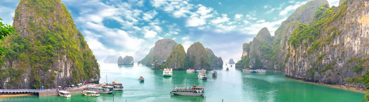 Halong Bay ligt in het noordoosten van Vietnam en is één van de populairste toeristische bestemmingen in het land. Het spectaculaire en iconische landschap staat bekend om de opvallende kalkstenen eilanden en het kristalheldere water. Deze idyllische plek bestaat uit tegen de 2.000 eilanden waar ontzettend veel te beleven valt. Je kunt er een prachtige boottocht maken terwijl je luncht met een prachtig uitzicht.