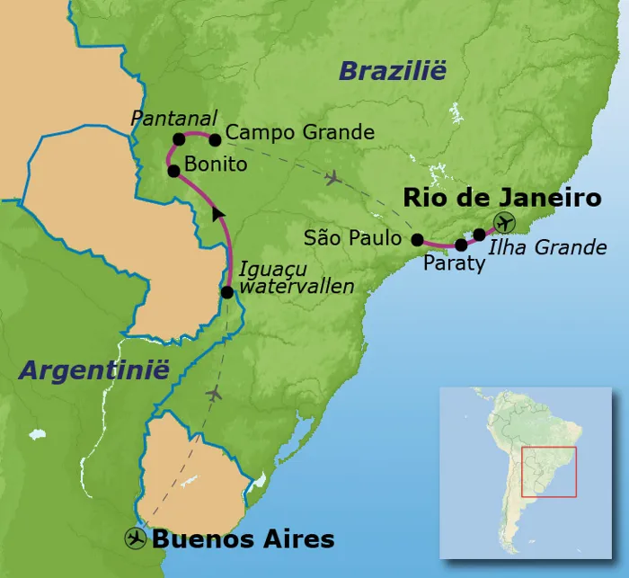 Laat je tijdens deze bijzondere familiereis door Argentinië en Brazilië overweldigen door de spectaculaire watervallen van Iguazu, de vele vogels in de Pantanal van Brazilië en de paradijselijke stranden van Ilha Grande. Raak met het hele gezin betoverd door het diepblauwe water van de Gruta do Lago Azul in Bonito en snorkel door de kristalheldere riviertjes van dit bijzondere gebied. Proef de sfeer van de tango in Buenos Aires en dans samen met de kinderen de samba in de stad met misschien wel de mooiste ligging ter wereld, Rio de Janeiro.