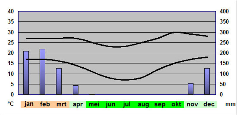 Ruwweg zou je het klimaat in twee seizoenen kunnen indelen: het droge seizoen en de regentijd.