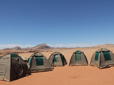 Daarnaast kamperen we in ruime tweepersoonstenten op campings met goede voorzieningen. Tijdens de reis zorgen wij voor tenten en voor de rest van de kampeer- en kookuitrusting. Alleen een slaapzak moet je zelf meenemen. De slaapmatjes zijn ongeveer 5 cm dik, maar je kunt zelf besluiten om een nóg dikkere mee te nemen. Omdat de tenten een muskietengaas sluiting hebben, hoef je geen klamboe mee te nemen. Je zet zelf je tent op en helpt met het inladen van de truck. Faciliteiten op kampeerplaatsen zijn vrijwel overal goed. Er zijn op een enkele plek na (Spitzkoppe, Himba) goede douches en wc’s, soms is er zelfs een zwembad.