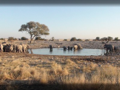 Okaukuejo is één van de drie campings die in Etosha NP zelf liggen. Van deze drie heeft Okaukuejo de bekendste verlichte waterplek. Hier kun je als je wilt 24 uur per dag rustig op een bankje zitten en de bonte dierenparade gadeslaan die hier doorlopend komt drinken. In de vroege avonduren is het niet ongewoon om zwarte neushoorns, olifanten en leeuwen op hetzelfde moment te zien drinken. We kamperen hier. Faciliteiten zijn o.a. een restaurant, bar, winkel en zwembad.