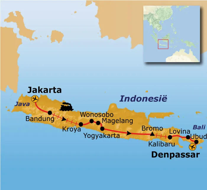 Tijdens deze rondreis door Indonesië maak je kennis met de mooiste hoogtepunten van dit land in deze complete, scherp geprijsde reis. De eilanden Java en Bali bieden een enorme variatie aan bezienswaardigheden: het imponerende Jakarta, de paleizen van de sultansstad Yogyakarta. Tijdens de reis zie je de Borobudur, de Bromovulkaan en kun je tussen de sawa's (rijstvelden) door fietsen of wandelen. Op Bali kun je snorkelen in de azuurblauwe zee en rondstruinen in het kunstenaarsdorp Ubud.