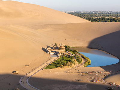 Vervolgens brengen we een bezoek aan Crescent Moon Lake. Dit is een oase in de vorm van een halve maan, omringd door de Taklamakanwoestijn. Het meer heeft historische betekenis als stopplaats voor karavanen langs de Zijderoute. Het water van het meer glinstert te midden van torenhoge zandduinen, wat het een prachtig contrast maakt. Na dit bezoek reizen we weer terug naar Dunhuang.
